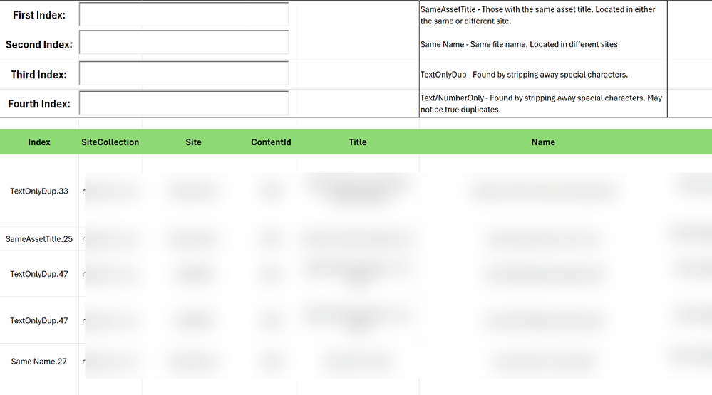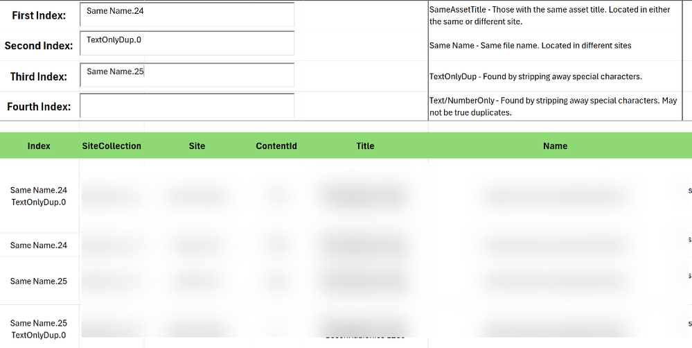 I have a workbook to find duplicates in content that is housed on our site. This workbook has different worksheets that are combined into one using Power Query and each instance is tracked using an index key to specify what each is a duplicate of and of which type. From there, I used the Power Query output table name (Duplicates) to create a dashboard, that has search boxes to help narrow down the list so it's easier to find the related duplicates.