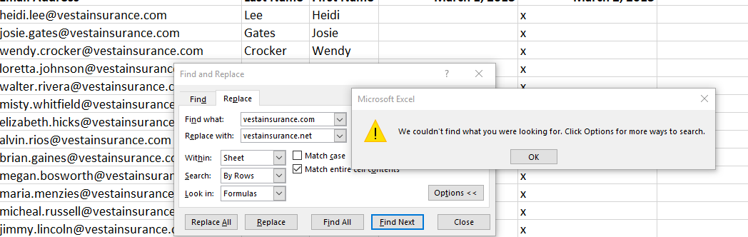 i am new to Excel, and just starting to learn it in my business computer class. my teacher recommends this site to try their downloadable practice documents https://edu.gcfglobal.org/en/excel2013 yet whenever i try finding something i know is there like a website, i get an error in find and replace telling me it was unable to find what i was looking for, and to look in options, when i do that, it tells me its something to do with my settings for Excel itself that i have no idea to get to, despite my trust settings set to allow downloaded documents to be edited soon as i open them. here is the pic asking me to look in options that are clearly visible yet at the same time unable to find what is also clearly there i would like to replace!