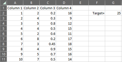 Dim v() As Variant Dim s() As Double Dim m() As Long Dim mr() As Long Dim n1, n2 As Long Dim t As Double Dim d As Double Dim c As Long Function FindSolution(rng As Range, tgt As Double) v = rng.Value n1 = UBound(v, 1) n2 = UBound(v, 2) ReDim r(1 To n2) ReDim w(1 To n2) ReDim s(0 To n2) ReDim m(1 To n2) ReDim mr(1 To n2) t = tgt d = 10000000 Call ProcessColumn(1) For c = 1 To n2 w(c) = v(m(c), c) Next c FindSolution = w End Function Sub ProcessColumn(c As Long) Dim r As Long Dim i As Long For r = 1 To n1 mr(c) = r s(c) = s(c - 1) + v(r, c) If s(c) <= t Then If c = n2 Then If t - s(c) < d Then d = t - s(c) For i = 1 To n2 m(i) = mr(i) Next i End If Else Call ProcessColumn(c + 1) End If End If Next r End SubUse like this in a cell formula: