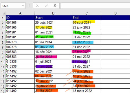 Hello, I've got several employees identified by ID for which I can have several contracts with a start date in one column and an end date in the following one and I need to find out for each employe...