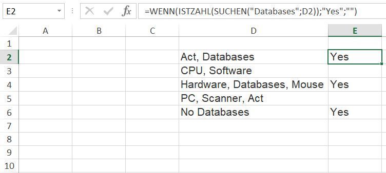 For example I have text in my tag column D that is comma separated. As an example: (Act, Databases) are within a cell. I wanted a formula to search the column D for “Databases” and add a Yes within another cell.