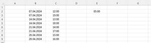 Thank you very much, my landgenoot. This is already a great help! I've edited the file a bit. In E2 I now have the time, that I want to find an appointment for and in E3 I now have the minimum hours between the starts of appointments. The first question I have is, how can I change the formula in G2 so that when I enter e.g. 21:00 in E2, 28.04.2024 pops up in G2? The second question I have is, how can I change the formula in G2 so that when there are no results it says e.g. "No results" (instead of "#CALC!"). And the third question I have is, as you can I see I have added Sundays in May when I don't have appointments yet. How can I change the formula in G2 so that these open Sundays are included, as well? Thank you very much in advance!