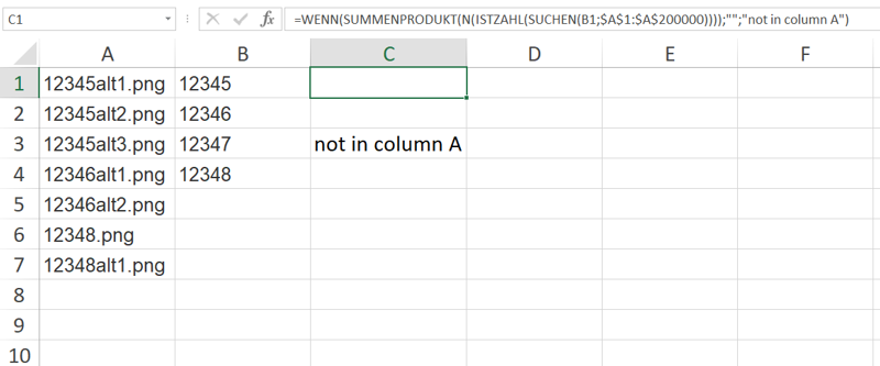 =IF(SUMPRODUCT(N(ISNUMBER(SEARCH(LEFT(A1,5),$B$1:$B$3)))),"","not in column B")For .png which start with 5 numbers you can apply this formula.