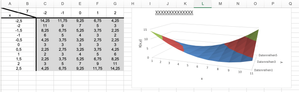 Excel204847 Get rid of the merged cells for the row and column headers. Then select A1 to F12 and insert the surface chart. The correct axis labels will now be used automatically. If you insist on keeping the merged cells, you need to set the axis and series labels manually in the "Select Data Source" pop-up window.