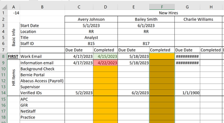 I'm working on a tracking sheet for when certain items are done for a new hire's profile. I currently have the due date column populated by a formula based upon the hire date. The c...
