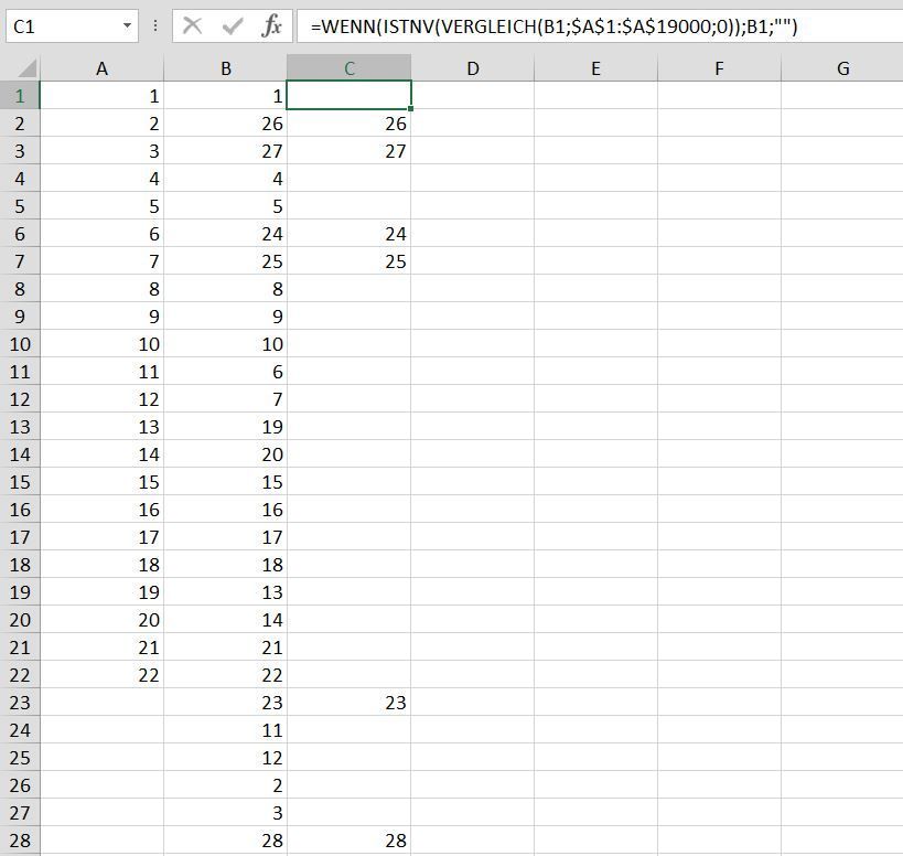 =IF(ISNA(MATCH(B1,$A$1:$A$19000,0)),B1,"")You can try this formula in cell C1 and copy down as required.