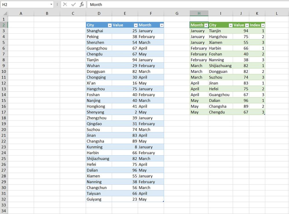 let Source = Excel.CurrentWorkbook(){[Name="Tabelle1"]}[Content], #"Grouped Rows" = Table.Group(Source, {"Month"}, {"GetandTransform", (t)=> let sort = Table.Sort(t,{"Value", Order.Descending}), AddedIndex=Table.AddIndexColumn(sort,"Index",1), SelectRows = Table.SelectRows(AddedIndex, each [Index] < 4) in SelectRows }), #"Expanded {0}" = Table.ExpandTableColumn(#"Grouped Rows", "GetandTransform", {"City", "Value", "Index"}, {"City", "Value", "Index"}) in #"Expanded {0}"