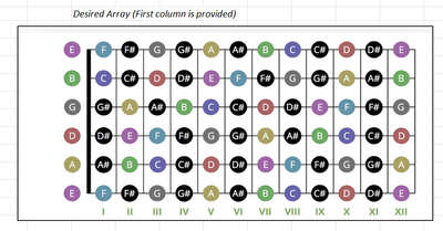 Fretλ = TAKE(DROP(altStandard, , XMATCH(string,altStandard)),,12)I used the REDUCE/VSTACK combo to generate the full output array