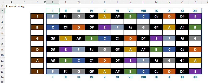 WorksheetFormula = REDUCE(fretLabels, Strings, Buildλ) Buildλ = LAMBDA(tuning,string, VSTACK(tuning, IF(string <> "", Fretλ(string), EXPAND("", 1, 12, "")) ) )For me, it provided an excuse to use some of the new array shaping formulas as an integral part of the calculation. That is not yet part of a process that comes naturally!