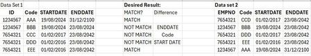 The other one is complicated: one row on the left could have 3 matches with multiple rows on the right - one row with a mismatch on code, another row with a mismatch on start date...