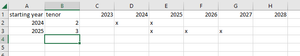 hi together, I need a formula that puts a "x" in the following columns out of two information (starting year) and (tenor) So when in A2 is 2024 and in B2 is 2 I need an "x" in D2 and E2. ...