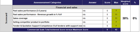 The answer is chosen from a drop-down list. The weighted score needs to adjust if a row is chosen as 'not applicable' (n/a).