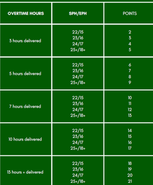So if someone has worked 3 hours of overtime up to 5 and then also hit the "22/15" SPH/EPH basically messages sent per hour. They would get the 2 points 23/16 the 3 points and so on. I started to struggle when I got to the 5-7 hours overtime criteria and hitting the 22/15 SPH/EPH and the points it then would assign.