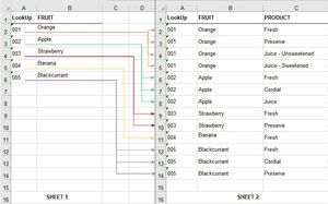 =INDEX(Sheet1!A:A,MATCH(Sheet2!$B2,Sheet1!B:B,0))