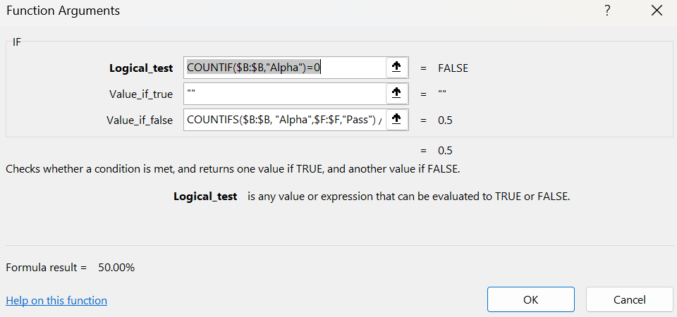The reason you see 50% in the Formula Arguments dialog but 0% in the worksheet cell is not because the formula is wrong. It is due to Excel’s handling of empty strings ("") in numeric or percentage-formatted cells. When IF returns an empty string in one branch, Excel can temporarily coerce that result to zero or fail to refresh the displayed value until recalculation.