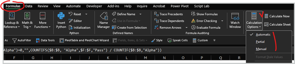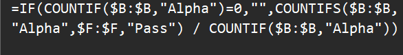 =IF(COUNTIF($B:$B,"Alpha")=0, NA(), COUNTIFS($B:$B,"Alpha",$F:$F,"Pass") / COUNTIF($B:$B,"Alpha"))