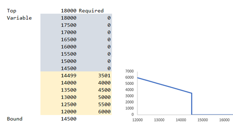 - keao46Copper ContributorSorry I meant to say if the variable number is between 13000 and 14499 then I want the answer to be exactly what it is. ex. 18000-14500=0, ex. 18000-12999=5000, ex. 18000-14000=4000. Is this possible to formulate? Thank you