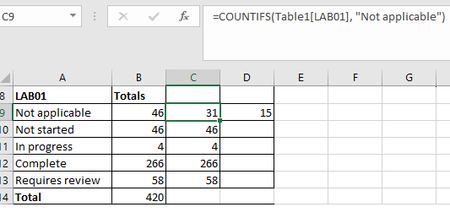 "=COUNTIFS(Table1[LAB01], "Not applicable", Table1[College], "CLES")"