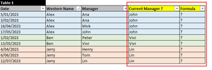 Hi guys , From table 1, I want to get the current manager of staff by the latest date as the screenshot below. Could you please help me with the excel formula? Thanks ! Best Regards, N...
