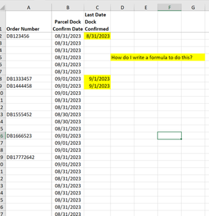 I have a large spreadsheet that lists order numbers in column A and the date that each parcel within that order was dock confirmed in column B.  I need to create a formula to look at the dates in col...