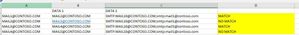 e.g. in Column D, you have MATCH in D2 and NO MATCH in D3, can you explain the logic behind these two desired output? Maybe then I would pick the logic and derive a suitable formula to return the desired output.