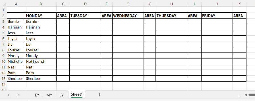 I am trying to get data from each of our areas of the school staff timetables EY MY LY and summaries what days each staff member works where to another sheet, as staff move around. I would appreciate some help please.