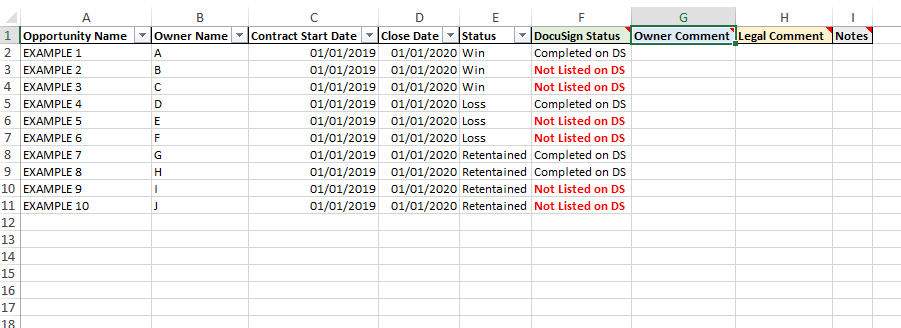 Columns F-H are populated by the end user via set answers in a drop down list however, depending on the answer given in column F, the other 2 columns may not need to be completed.