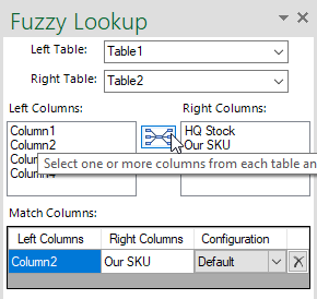 I added Fuzzy Match to excel, but the match/output columns won't load. Is there something I need to do under configure? It works, but brings in all columns from both sheets.