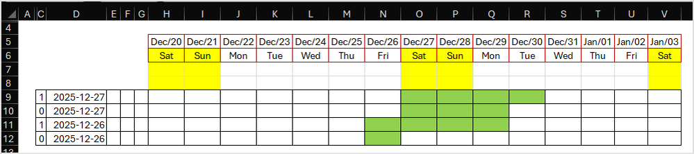 =($D9<=H$5) * (WORKDAY($D9-1, $C9)>=WORKDAY(H$5,-1) ) - NikolinoDEPlatinum Contributor