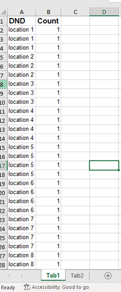 I have a tab "Tab1" with a column named DND that has multiple rows with the same cell data. See my pictures, for example there are three lines for "location 1". I need to count the totals in the "Cou...