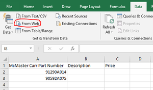 Hello, Can anyone please help me to link excel to McMaster Carr website. As seen in the picture below, I have part numbers in a column and I want to get its description and price in adjacent columns...