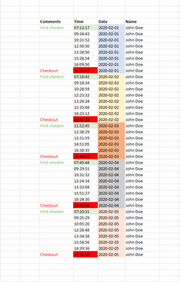 Hi, I'm trying to find a way to get the hours between the first login (timestamp) that the employee did and the last when the person left the office. If you see the attached picture, the pe...