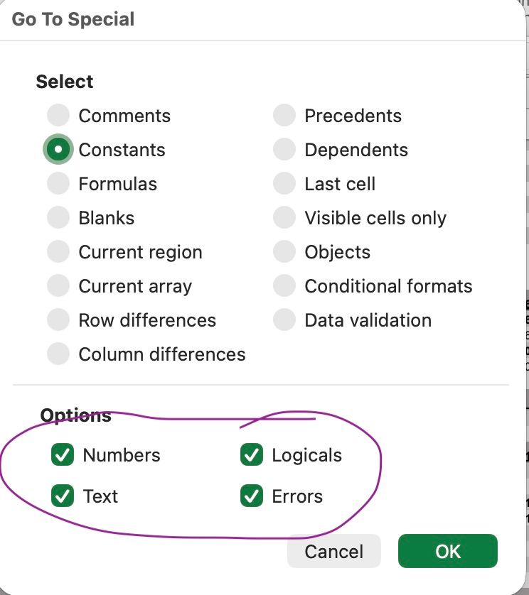 after latest updates Tahoe and Excel go to special options are unavailable to be checked off F5 - Special... - Constants - checkboxes are not working
