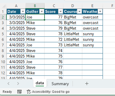 I ust updated the attached so the list of golfers on the Summary tab is used for data validation on the data tab (i.e. you are sure to always enter the name correctly on the data tab and gives you a drop down to make it easier). If you need to add a new golfer you just add to the list/table on the summary tab and copy the corresponding formulas down.