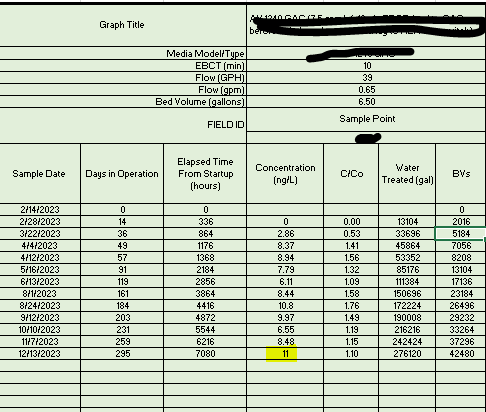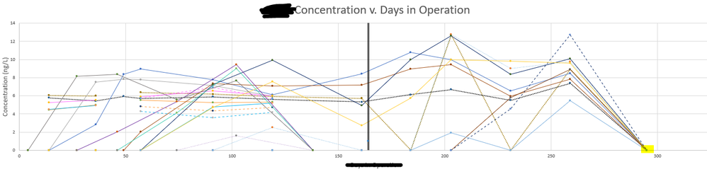 I have an issue where the data I am trying to plot on my table is not showing up correctly in the graph. As shown in the screen shot, I am plotting the concentration vs days in operation. There are other tables associated with this graph that are not visible.