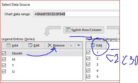 So, in your chart, delete the month series on the bottom by clicking on it and e.g. pressing the Del key. Then right click the chart and select the option Select data. In the dialogue, on the right side, click on Edit to assign a range ($C$3:$C$40) to the horizontal axis labels.