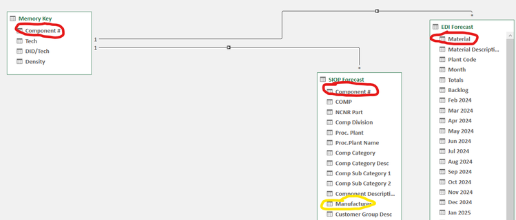 I am trying to build a data dashboard for a work analysis project. I've had no trouble using power query to load the data, and building a power pivot data model. At first I struggled because the two main data sources (labeled SIOP and EDI in the picture) have many repeats of the same part number (common identifier). I solved this issue by creating a master key (with no repeats) - and this allowed me to create pivot tables of the data. I'm coming across one issue I can't solve: the tables all have a relationship by part #, but when I try to create a slicer for "Manufacturer" from the SIOP table to sort the data in the EDI table - the pivot table refuses to respond. It won't sort. I would have thought that because all the tables are linked by part # - that I can use the manufacturer field. Any ideas? Help is much appreciated, thanks!