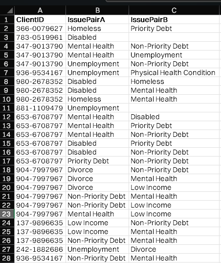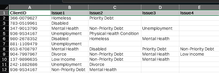 I have an excel sheet with a range (se below). The first column is a unique client ID. As the data may be collected over a period of time, the same client IDs may appear more than once (if they come back to the service provider). The data may include up to a maximum four issues that they are worrying about, and these are in adjacent columns to the client ID.