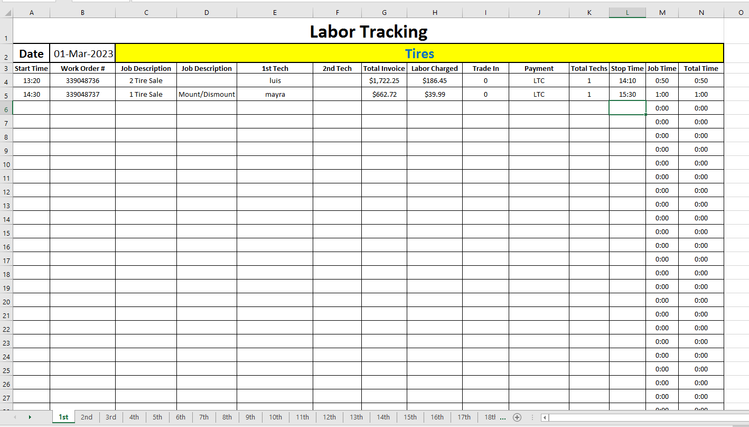 An observation, first: you are in the process of creating a workbook with one tab per day per month, with the purpose of labor tracking. I'm not sure exactly what you mean by "labor tracking," but will make the assumption that you want to know which person(s) worked on each job and how much was charged for that labor, and be able to summarize that for various pay and supervisory/management purposes.