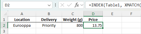 On calculator page I have options on dropdownlist: location (Europe or Another coutries) and delivery (Priority or Economy) and empty slot where you can put the weight. Last one is the total price where I need the right formula. If I change location, delivery and weight it should calculate the price, but I cant solve how to do it.