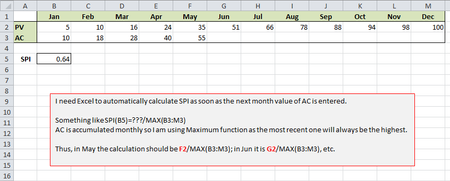 the formula I am currently using is SPI(B5)=f2/MAX(b3:m3)