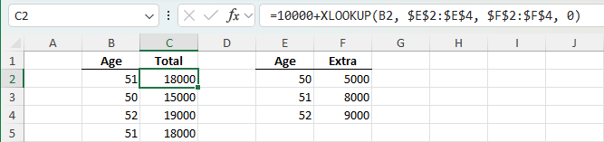 =10000+XLOOKUP(B2, $E$2:$E$4, $F$2:$F$4, 0)