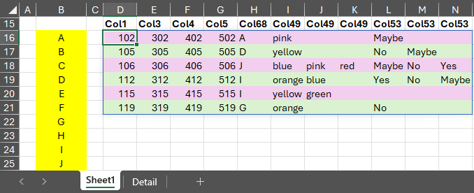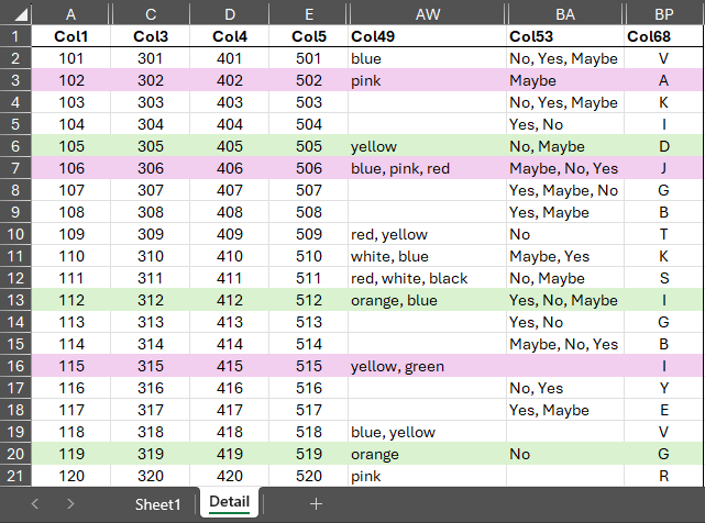 =LET( f, FILTER(Detail!$A:$BZ, (COUNTIF($B$16:$B$25, Detail!$BP:$BP) > 0) * (TRIM(SUBSTITUTE(Detail!$AW:$AW, CHAR(160), "")) <> "")), base, CHOOSECOLS(f, 1, 3, 4, 5, 68), split49, MAP(CHOOSECOLS(f, 49), LAMBDA(x, LET( cleaned, TRIM(SUBSTITUTE(x, CHAR(160), "")), IF(cleaned = "", {""}, TEXTSPLIT(cleaned, ",")) ))), split53, MAP(CHOOSECOLS(f, 53), LAMBDA(x, LET( cleaned, TRIM(SUBSTITUTE(x, CHAR(160), "")), IF(cleaned = "", {""}, TEXTSPLIT(cleaned, ",")) ))), SORT(UNIQUE(HSTACK(base, split49, split53)), 1, TRUE) )My answers are voluntary and without guarantee!