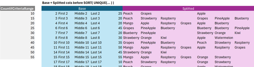 =LET( DataRange, Detail!A1:BZ1000, CountifCriteriaRange, B16:B25, delim, CHAR(44), nbspace, CHAR(160), Normalize, LAMBDA(str, LET( ReplacedNbs, SUBSTITUTE(str, nbspace, "" ), ReplacedEmpty, REGEXREPLACE(ReplacedNbs, "(^\s*,\s*|,\s*(?=,|$))", "" ), TRIM( REGEXREPLACE(ReplacedEmpty, "\s*,\s*", "," ) ) ) ), SplitToCols, LAMBDA(array,[normalized], LET( Normalized, IF( normalized = TRUE, array, Normalize(array) ), Thunk, LAMBDA(x, LAMBDA(x) ), Split, LAMBDA(array, IF( LEN(array), TEXTSPLIT(array, delim,, TRUE ), "" ) ), ThunkSplit, LAMBDA(accum,array, Thunk( Split( array ) ) ), arrThunks, SCAN(0, Normalized, ThunkSplit ), ExpandThunk, LAMBDA(rw,cl, INDEX( INDEX( arrThunks, rw, 1 )(), 1, cl ) ), MaxOutCols, MAX( LEN(Normalized) - LEN( SUBSTITUTE( Normalized, delim, "" ) ) ) +1, Splitted, MAKEARRAY( ROWS(array), MaxOutCols, ExpandThunk ), IFERROR( Splitted, "" ) ) ), RowsBP, COUNTA( Detail!BP:BP ), NormalizedBW, Normalize( TAKE( CHOOSECOLS(DataRange, 49 ), RowsBP ) ), ShrinkedData, HSTACK( INDEX(DataRange, SEQUENCE( RowsBP ), {1,3,4,5,53,68} ), NormalizedBW ), FilteredData, FILTER( ShrinkedData, IFNA( XMATCH( CHOOSECOLS(ShrinkedData, 6), CountifCriteriaRange ), 0 ) * ( CHOOSECOLS(ShrinkedData, 7) <> "" ) ), Base, CHOOSECOLS( FilteredData, {1,2,3,4,6} ), StackedArrays, HSTACK( Base, SplitToCols( CHOOSECOLS( FilteredData, 7 ), TRUE ), SplitToCols( CHOOSECOLS( FilteredData, 5 ) ) ), SORT( UNIQUE( StackedArrays ), 1, TRUE ) )* RegEx by Copilot