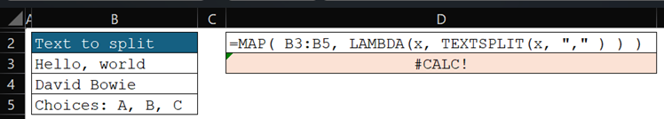 =MAP( {"a,b,c"; "d"; "e,f"}, LAMBDA(x, LET( cleaned, TRIM(SUBSTITUTE(x, CHAR(160), "")), IF(cleaned = "", {""}, TEXTSPLIT(cleaned, ",")) ) ) ) // #CALC!- NikolinoDEPlatinum Contributor