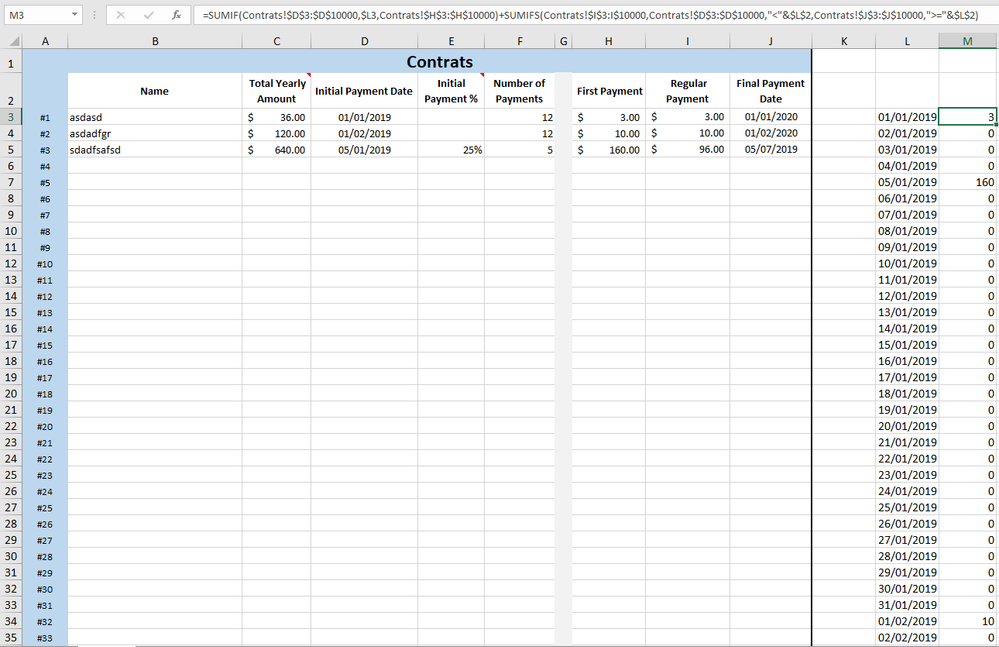 There seems to be 1 main issue with my formula. For the first month, from cell M3 until M35, the result is correct but from M36 on, it doesn't display any of the contract planned deposits. any idea what is wrong and how to fix it?