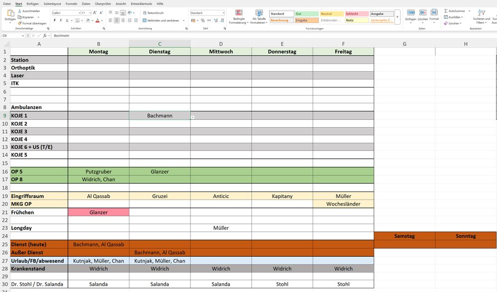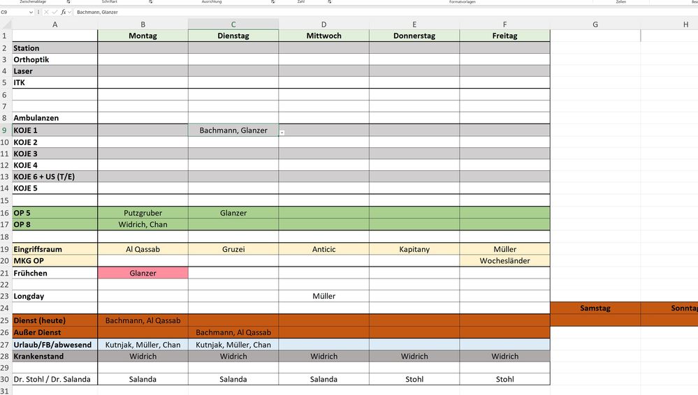 But there is a problem. When I manually type into this field using the keyboard, an error occurs. What does work is that if the field is empty, I can type anything into it and it will be saved in the cell exactly as I typed it. However, if the field was previously filled using the dropdown (e.g., A), and I type A bis 9 Uhr, the resulting value in the cell becomes A, A bis 9 Uhr instead of just A bis 9 Uhr. The distinction between manual input (which should overwrite the entire cell even if a value from the dropdown was there before) doesn’t work.