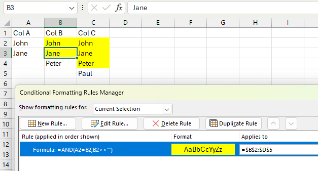 For example, below compare Col B to Col A and highlight the matches (John and Jane) but only highlight them in Col B. Then compare Col C to Col B for matches and highlight the matches (John, Jane and Peter) but again only highlight them in Col C. Screen shot of what I mean is attached.