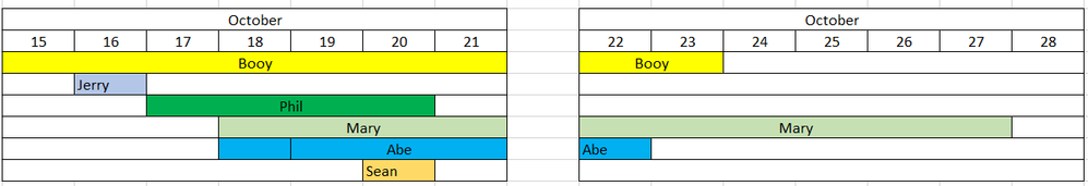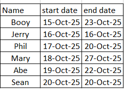 I hope i can explain this right, i have data that shows 3 things: person, start date and end date: