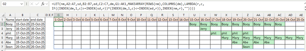 =LET(nm,A2:A7,sd,B2:B7,ed,C2:C7,dm,G1:AK1,MAKEARRAY(ROWS(nm),COLUMNS(dm),LAMBDA(r,c, IF((INDEX(dm,1,c)>=INDEX(sd,r))*(INDEX(dm,1,c)<=INDEX(ed,r)),INDEX(nm,r),""))))